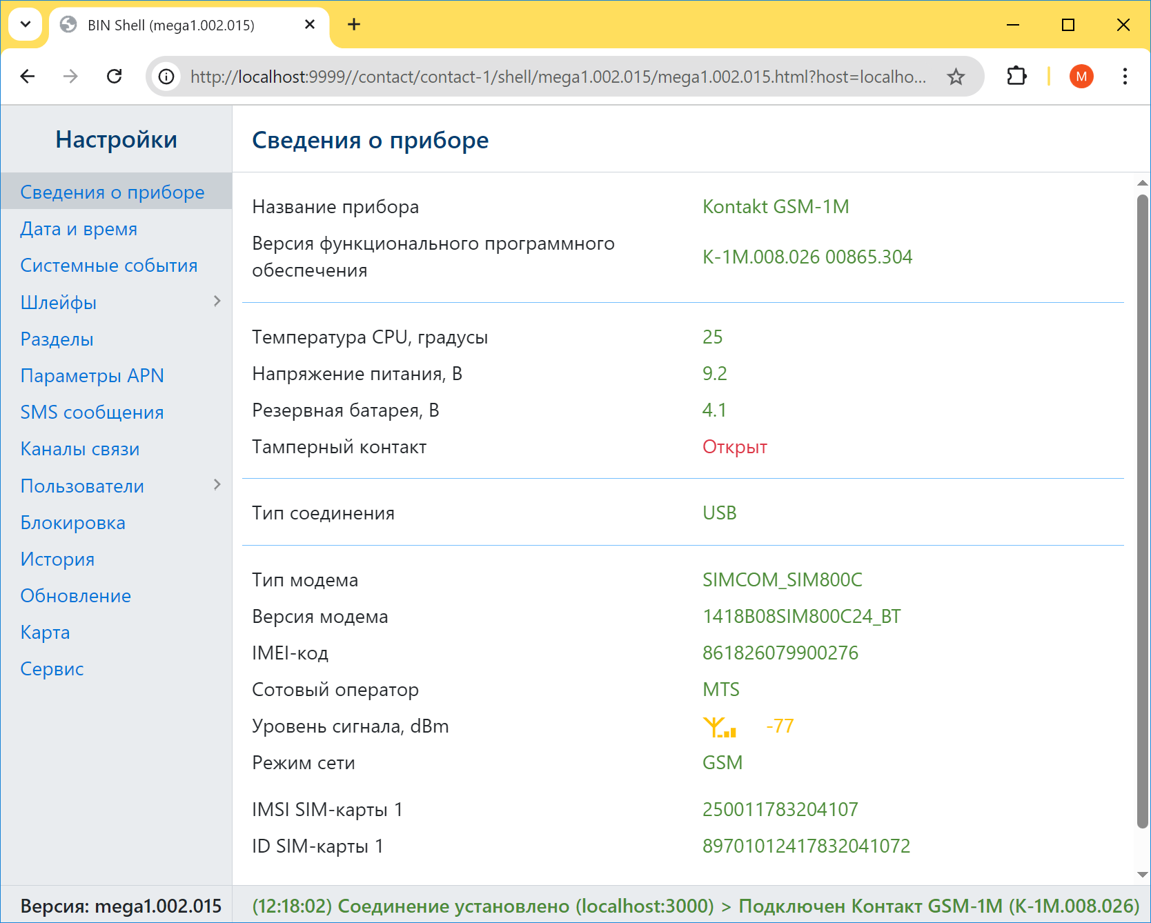 | IMSI SIM-карты | Поле отображает международный идентификатор мобильного абонента IMSI установленной SIM-карты в приборе. Идентификатор используется оператором сотовой связи для формирования отчётов системы биллинга. Инженер охранного предприятия, используя функцию поиска по идентификатору IMSI, получит из биллинга полную информацию по трафику, смс и звонкам SIM-карты. Охранному предприятию важно контролировать расходы на мобильную связь, если прибор стал генерирует больше трафика, чем запланировано, возможно возникли какие-то технические проблемы. |