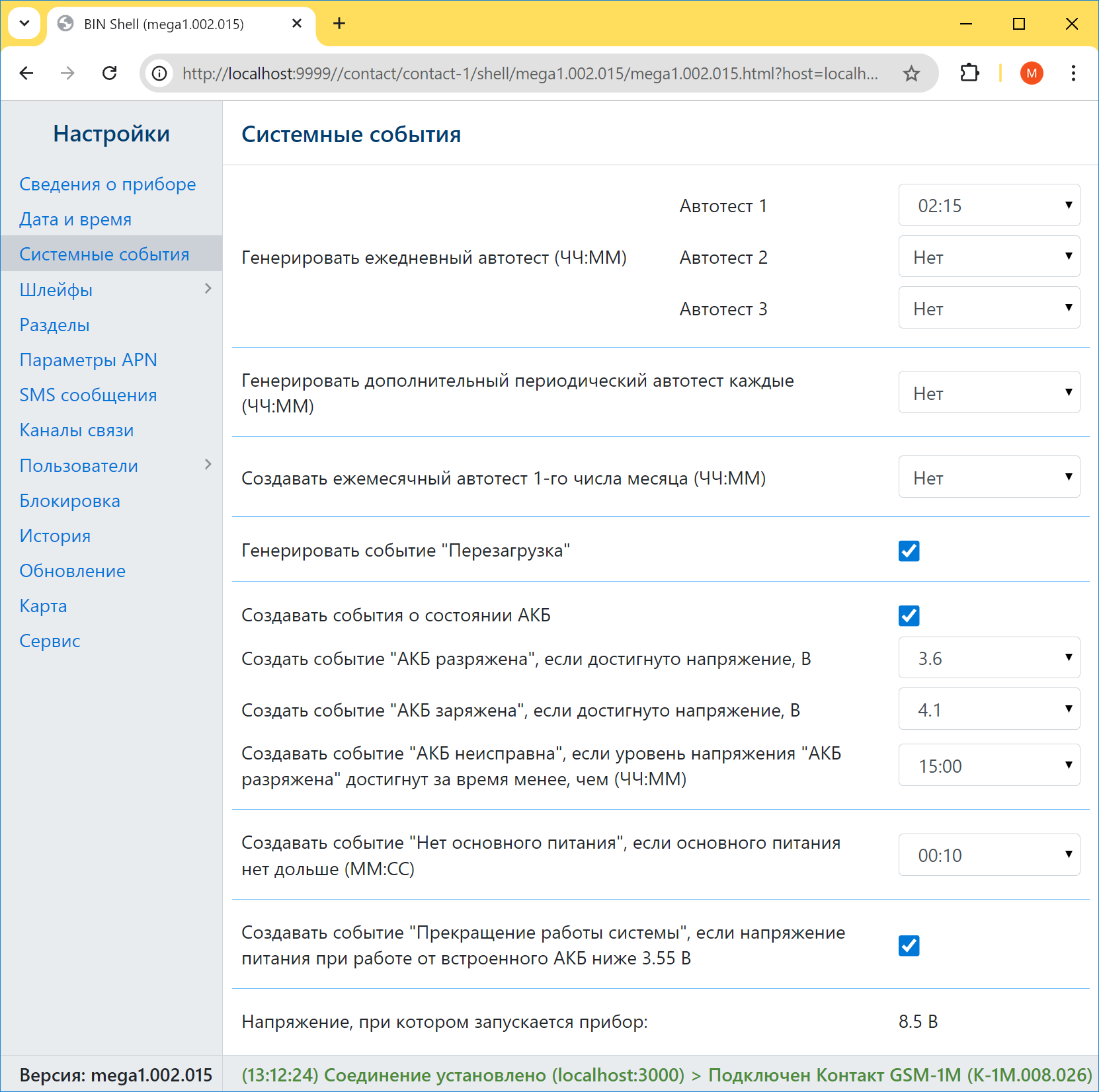| Создавать события о состоянии АКБ | Активирует возможность настроек настроек ниже. | |