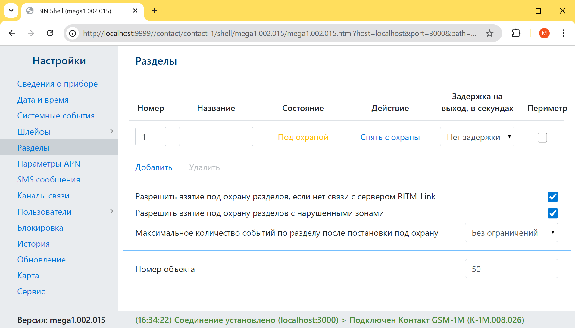 | Действие | Поле позволяет не выходя из программы настройки совершить действие взять раздел объекта под охрану или снять с охраны.