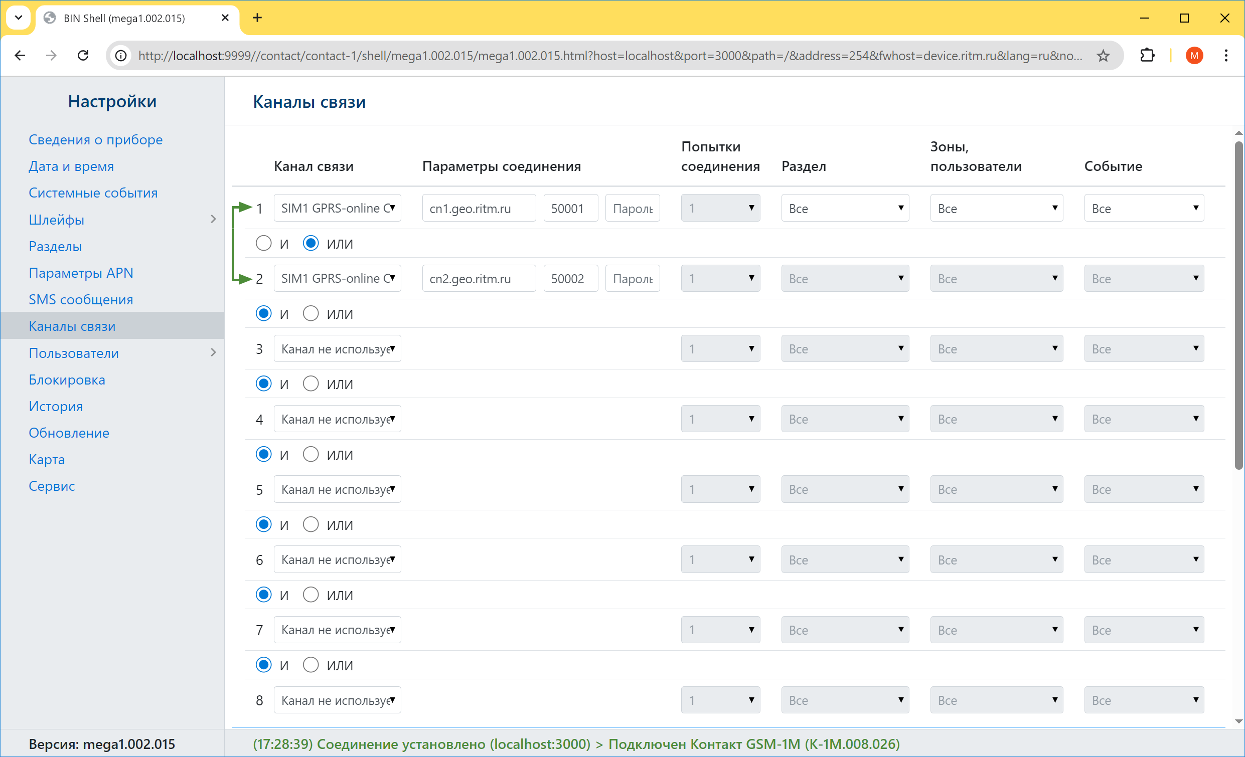 В этом разделе рассмотрим экран "Каналы связи" - страница, на которой настраивается какие события по каким разделам, по каким зонам и пользователям - куда передавать.