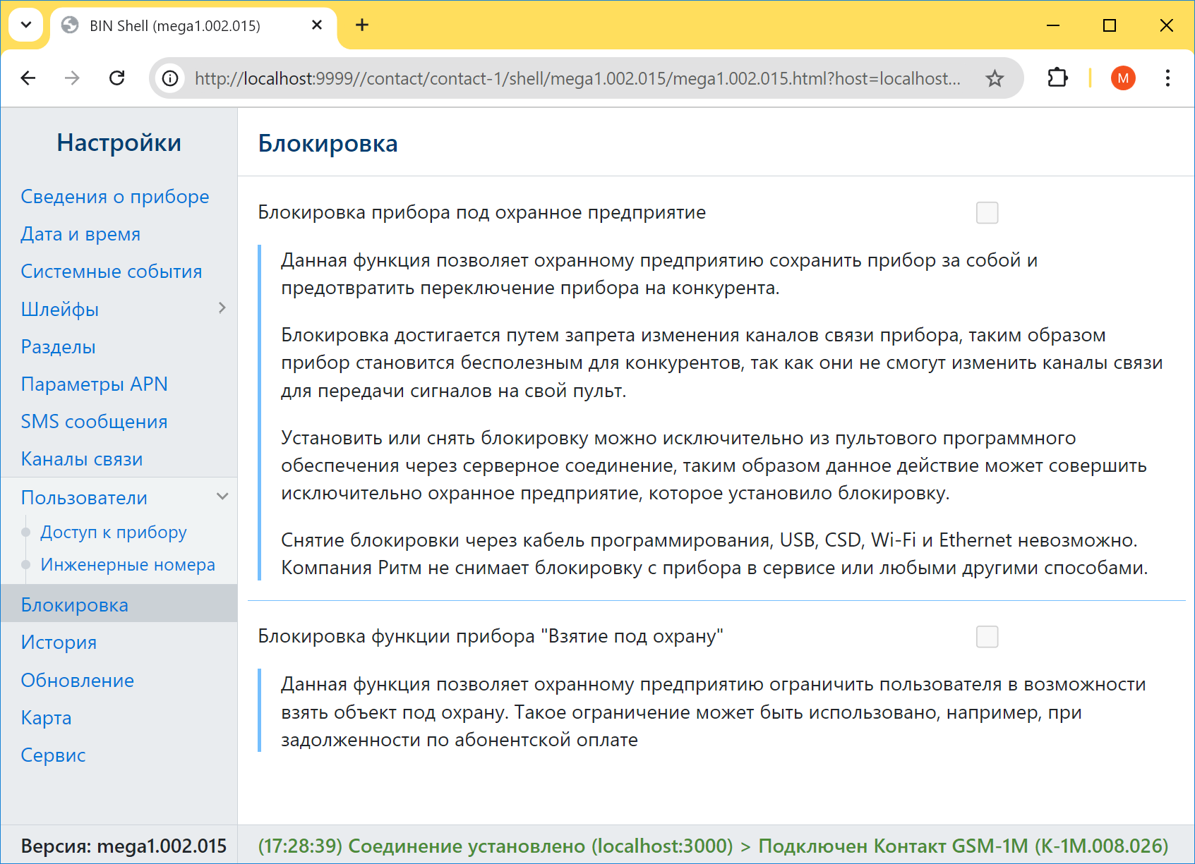 - Снятие и установка блокировки доступны только через мониторинговое программное обеспечение ПО GEO. RITM и Ritm-Link