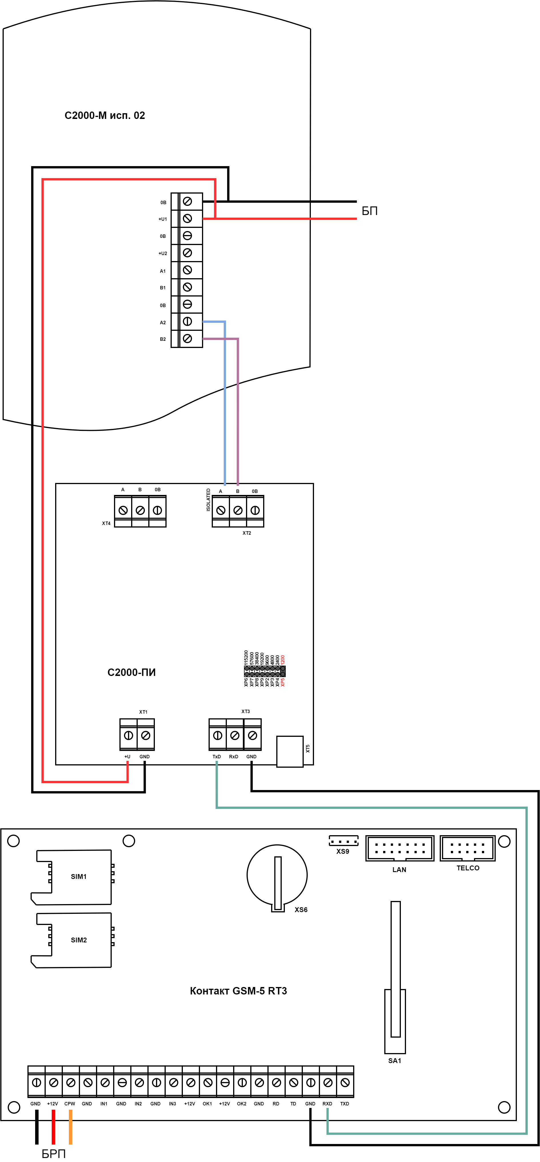 Подключите «С2000М исп.02» к С2000-ПИ, а С2000-ПИ к Контакт GSM-5 RT3 согласно схеме.
