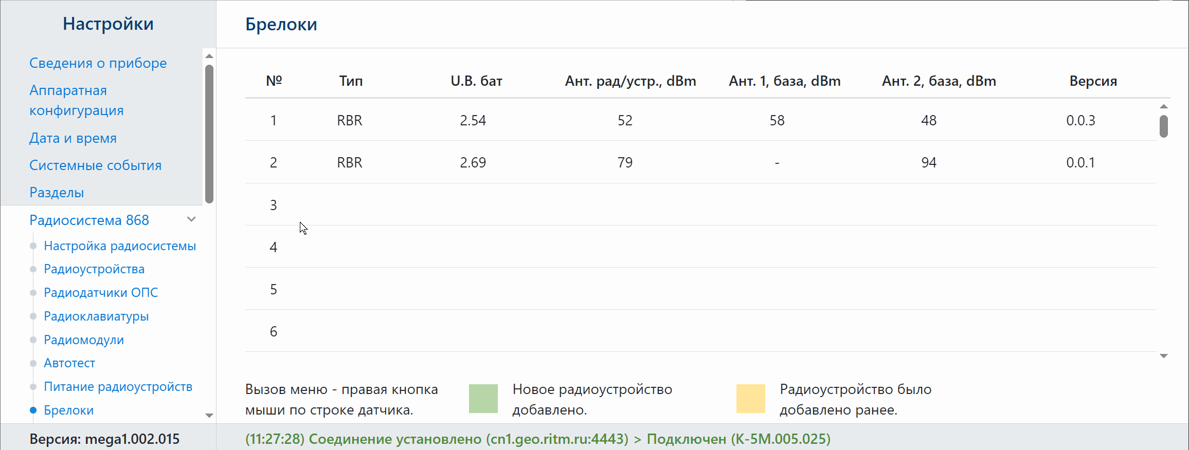 - Добавленное радиоустройства отобразится новой строкой, закрашенной зелёным цветом.